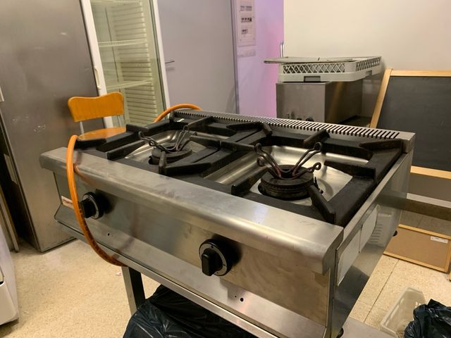 Detalles del productoCocina de gas profesional de dos fuegos. Está en buenas condiciones, aunque muestra señales de uso.