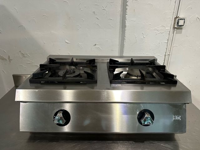 Detalles del productoCocina industrial de gas con dos fogones, ideal para negocios de hostelería.
