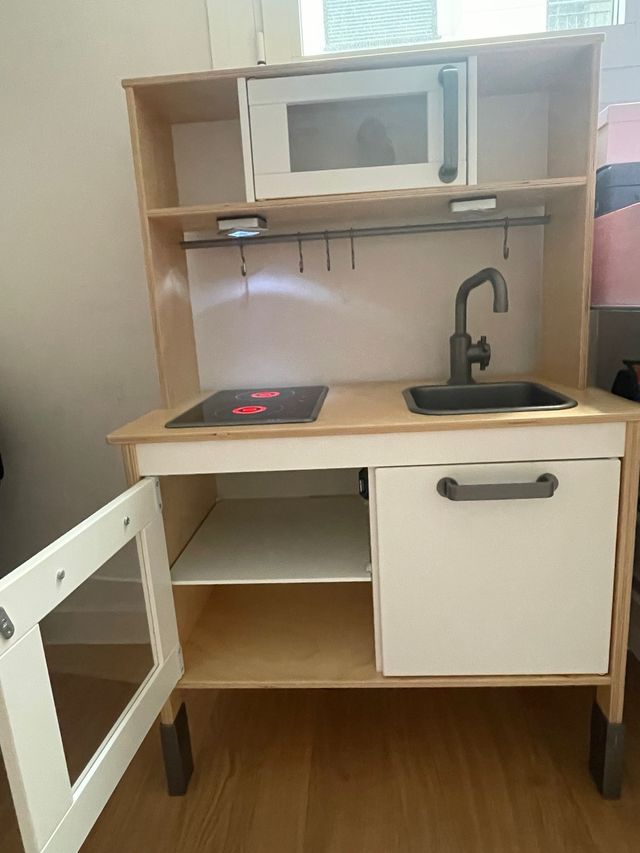 Divertida cocinita de juguete de Ikea, perfecta para los más pequeños. - Diseño de madera. - Incluye fregadero y fogones. - Puerta abatible con ventana.