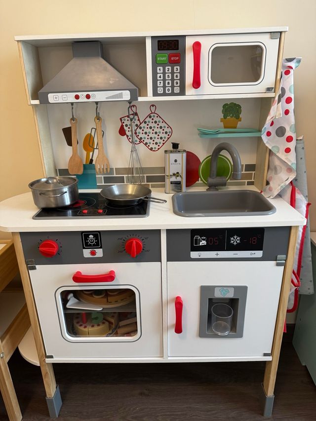- Incluye accesorios como ollas, sartenes y utensilios de cocina.