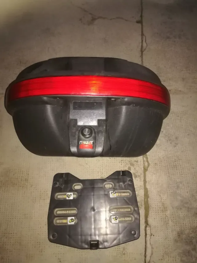 Detalles del productoCofre o baúl para moto de color negro con una banda roja en la parte superior capacidad 1 casco. Incluye la base de montaje.Mas información 697163524.