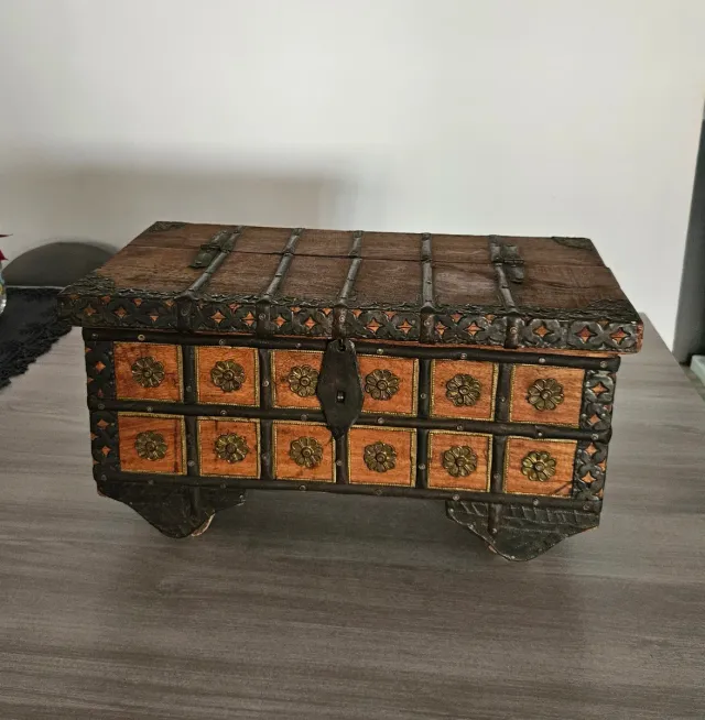 Precioso cofre de madera con detalles metálicos y florales.