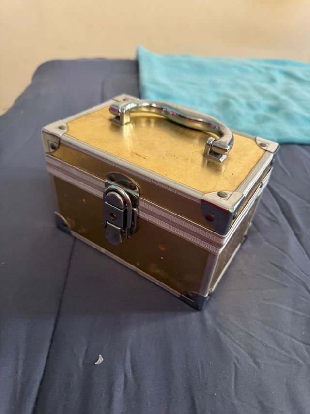 Detalles del productoPequeño cofre o neceser de color dorado, ideal para guardar maquillaje o pequeños objetos.