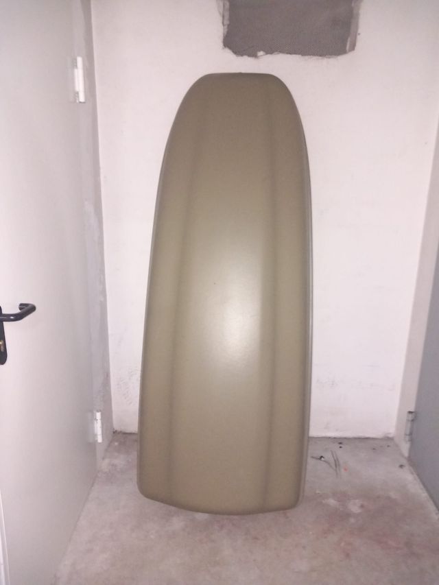 Cofre portaequipajes de color beige, con un diseño alargado y aerodinámico. - Forma ovalada. - Acabado liso.