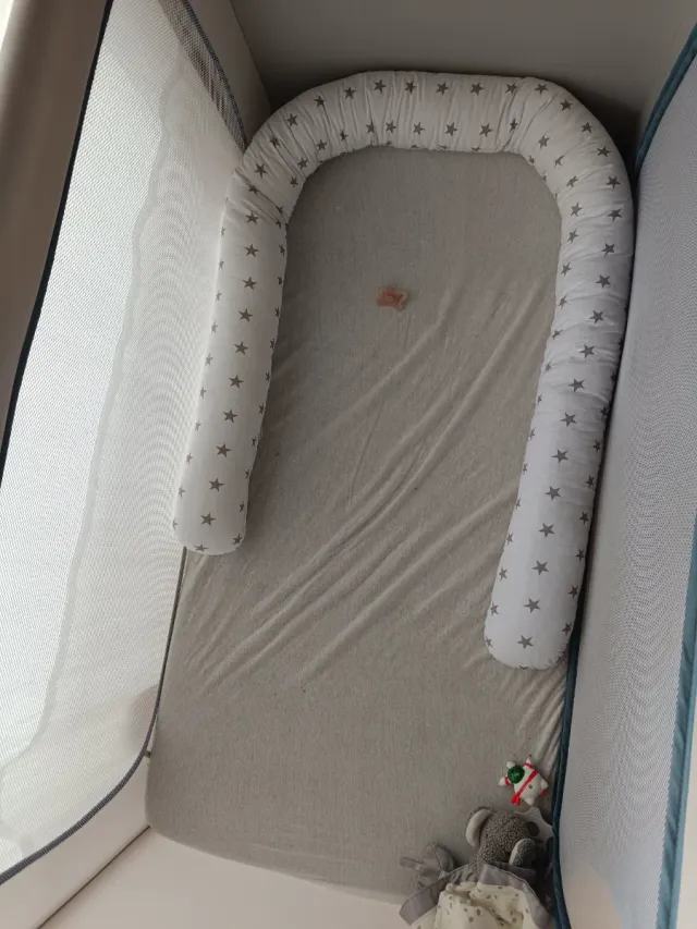 Detalles del productoProtector de cuna con divertido diseño de estrellas grises con fondo blanco. Medida 200 cm. Para la minicuna y luego para la cuna. Muy útil, el bebe se siente muy resguardado y agusto.
