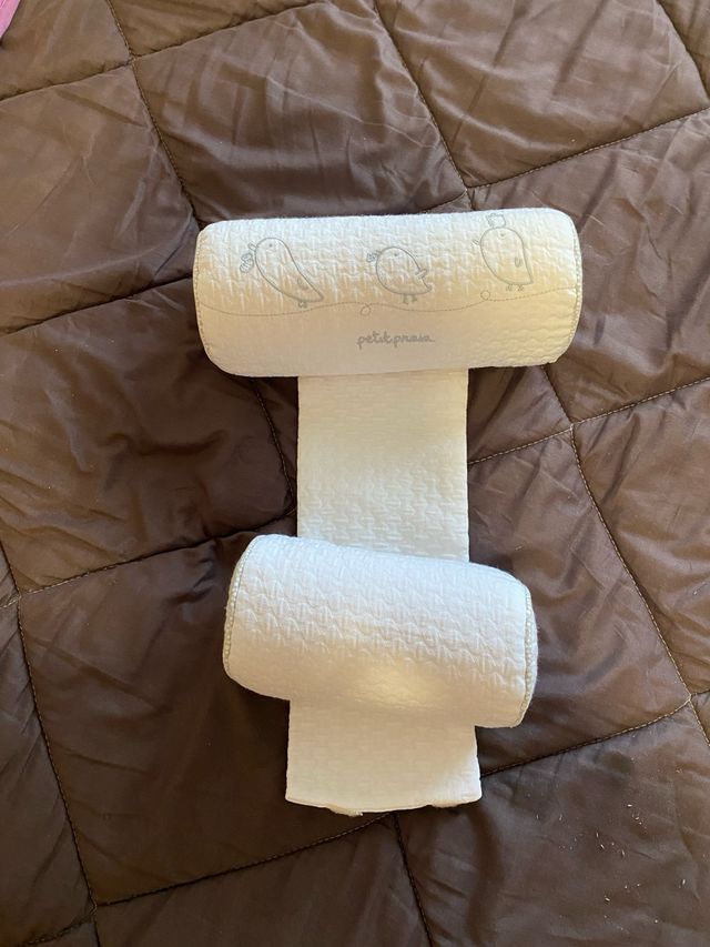 Detalles del productoCojín antivuelco de la marca Petit Praia, diseñado para la comodidad del bebé. Presenta un suave tejido blanco con un estampado de pajaritos y el nombre de la marca.