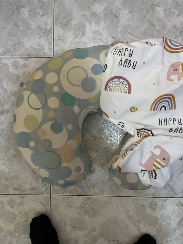 Detalles del productoCojín de lactancia con un diseño de círculos en tonos pastel y una funda con estampados de elefantes y arcoíris. Incluye dos fundas lavables.