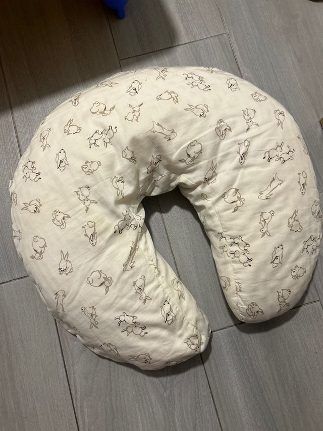 Detalles del productoCojín de lactancia con un adorable estampado de conejos en tonos beige.