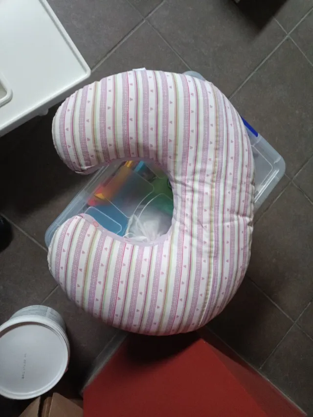 Cojín de lactancia con un diseño de rayas verticales rosas y corazones. Es suave y cómodo. - Funda con estampado de rayas y corazones. - Forma ergonómica para lactancia.