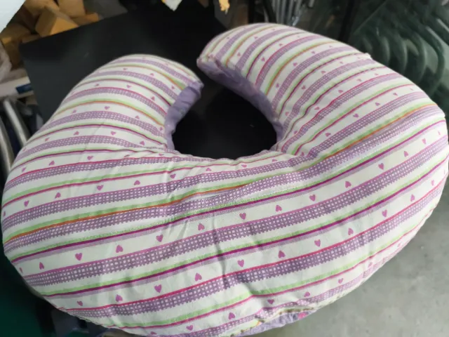 Detalles del productoCojín de lactancia con un diseño de rayas y corazones.
