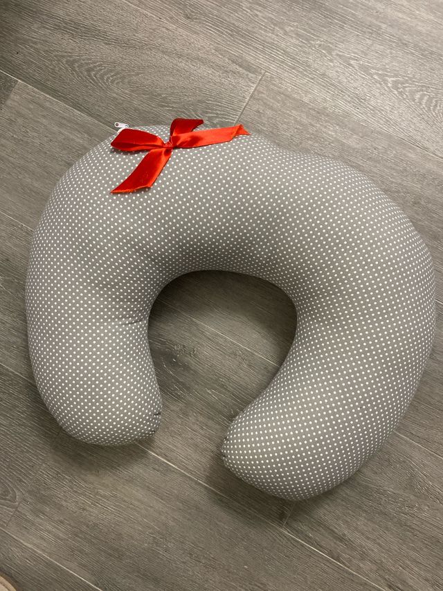 Detalles del productoCojín de lactancia con un diseño de lunares blancos sobre fondo gris. Presenta un lazo rojo decorativo en la parte superior.