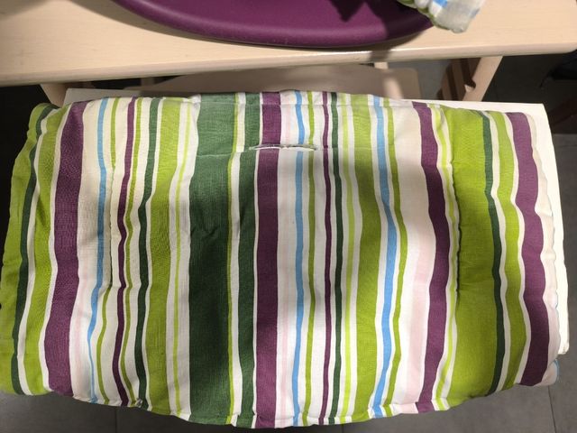Detalles del productoCojín para trona Stokke Tripp Trapp V1 con un diseño de rayas verticales en varios colores.