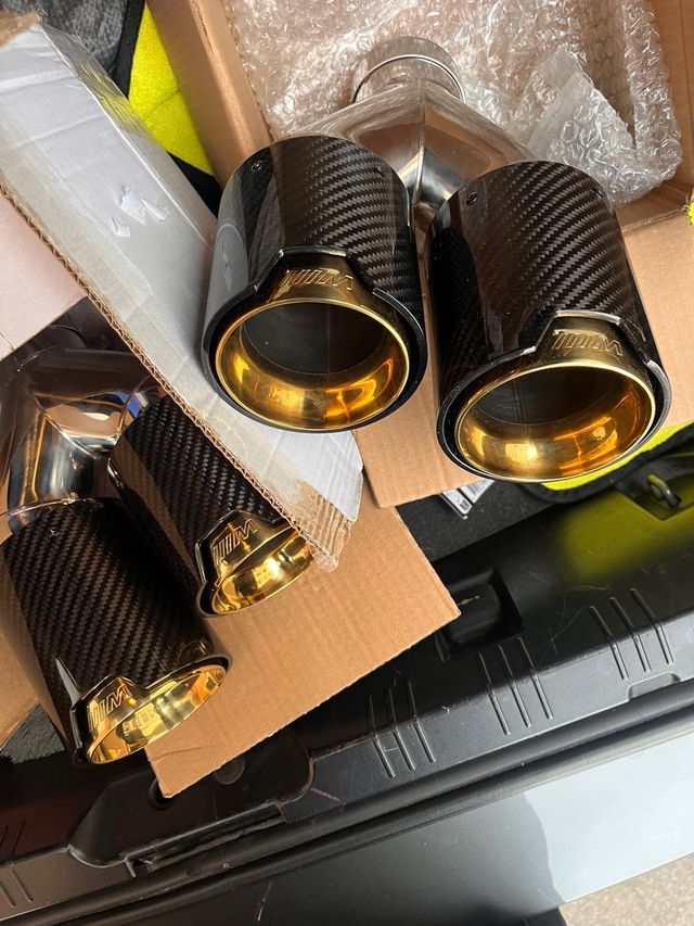 Detalles del productoSet de colas de escape con acabado en fibra de carbono y detalles dorados.
