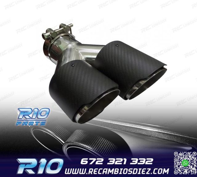 Detalles del productoMóvel: 672 321 332 - Referencia: ESC010000. COLA ESCAPE CARBONO DOBLE IZQUIERDA Medidas: Diámetro de entrada interior 68 mm, exterior 70 mm Diámetro de salida interior 80 mm, exterior 90 mm Largo del lado izquierdo de 239 mm Largo del lado derecho de 256 mm Monatje. Instalación sencilla, sujección mediante tornillo o punto de soldadura. Imagen. Dale un toque más deportivo al vehículo con esta cola de escape.