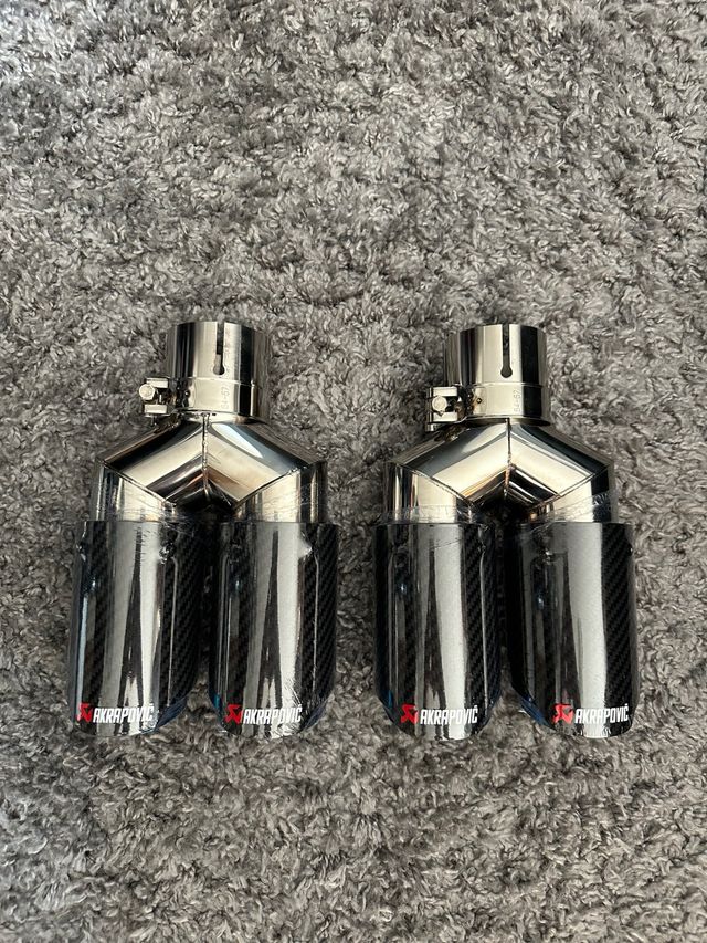 Detalles del producto2 Colas Dobles Escape Akrapovic rectas en carbono e interior azul.