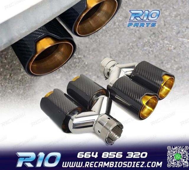 Sin valoracionesDetalles del productoMóvil: 664 856 320 - Referencia: ESC010119. COLAS ESCAPE BMW LOOK M PERFORMANCE DORADO CARBONO Especificaciones: Modelo: Look M Performance Lado de montaje: Izquierda / Derecha Tipo de salida: Doble Color: Dorado / Carbono Diámetro de entrada Interior: 60 mm Exterior: 64 mm Diámetro cada salida exterior: 94mm Largo: 250 mm Ancho total: 190 mm Montaje. Fácil instalación sin modificar nada en el vehículo. Kit completo. Incluye las 2 colas de escape listas para instalar. Estos no son productos originales de la marca BMW. El artículo ofrecido, solo es compatible para los modelos d