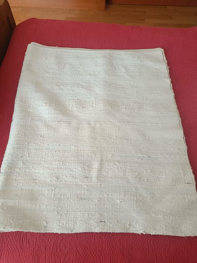 60 cm x 60 cm de largo y ancho. Está doblada a la mitad. Colcha hecha a mano con más de 50 años de antigüedad. Totalmente rustica
