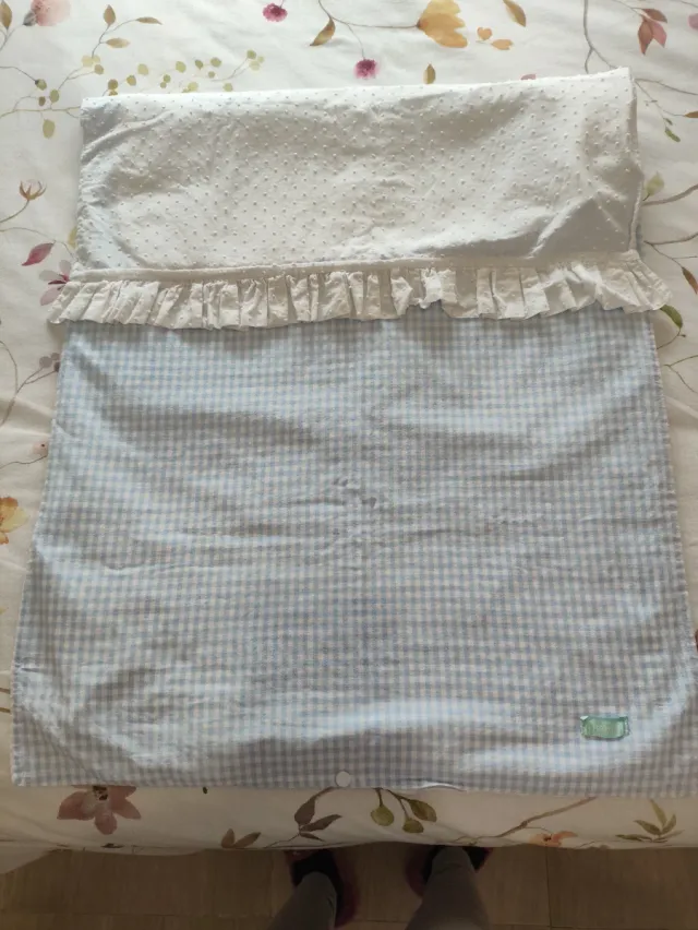 Detalles del productoSe vende preciosa colcha para carro bebe, es ideal para invierno porque tiene relleno de nórdico que mide 58 por 88 y también para entretiempo porque se puede quitar el relleno. Es reversible, tela Vichy celeste combinada con plumeti blanco, es preciosa y está nueva.