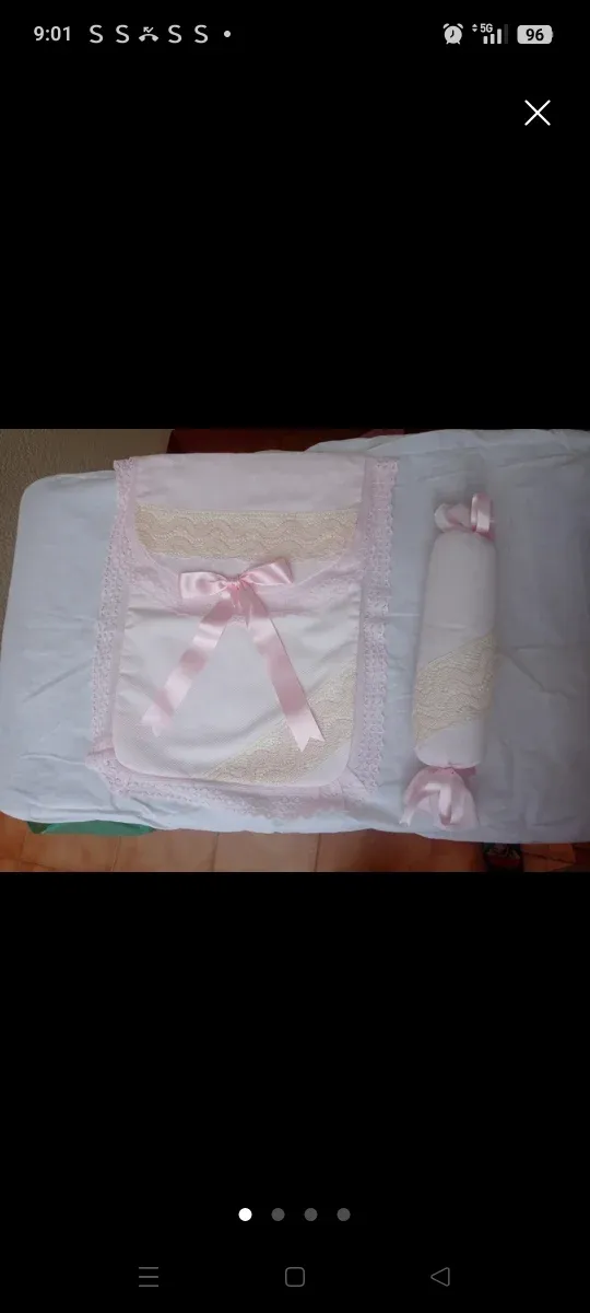 Conjunto de colcha y caramelo para cuna, con un diseño delicado y adornos de encaje. - Colcha con lazo de satén rosa. - Caramelo con detalles de encaje.