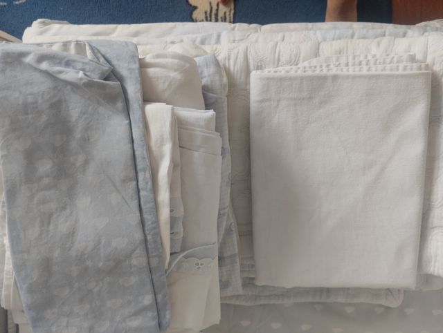 Detalles del productoTres juegos completos de bajera y sábana, una bajera extra, dos fundas de almohada y protector de colchón. También incluye la colcha reversible de la cuna y la chichonera con el relleno a la que hay que coser alguna cinta. Incluyo dos fundas de cojín y colcha de cama a juego de la colcha de nubes, aunque los cojines están algo desgastados de un lado y la colcha también tiene un jirón pero del otro están bien tanto fundas como colcha. No pongo fotos de la colcha de cama porque esto es un regalo si se quiere