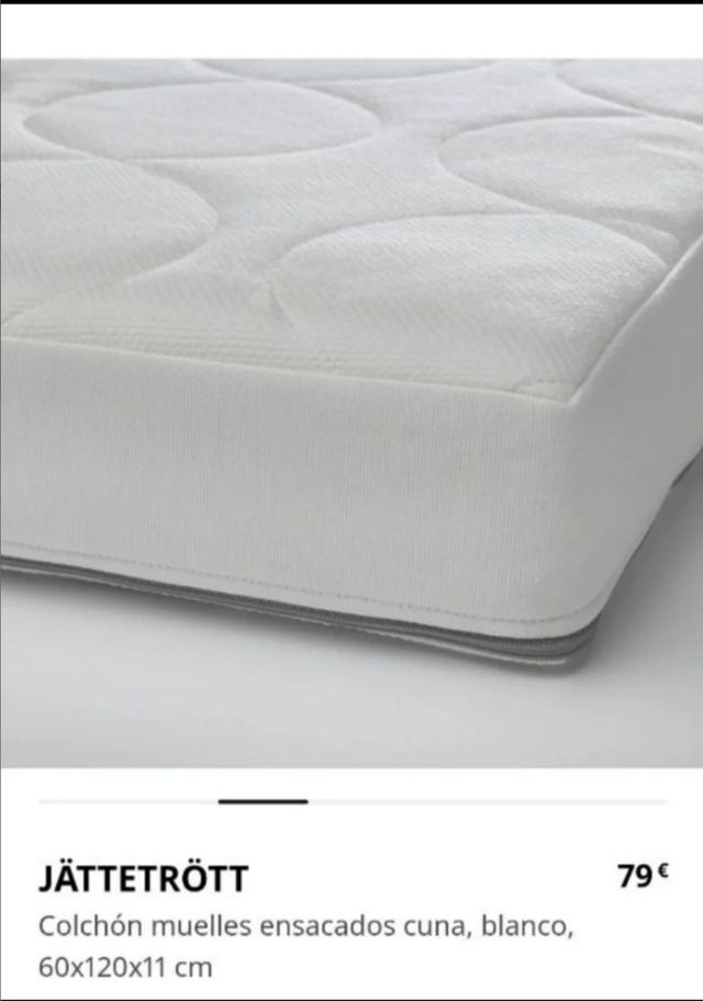 Detalles del productoColchón de muelles ensacados individualmente, con lo que se adapta al cuerpo y puede usarse durante años. Es la gama de Ikea Jattetrott, mide 120*60*11 centímetros de alto. Estan como nuevos, ya que se usaron para una segunda residencia. Nuevos valen 80€. Medidas del producto