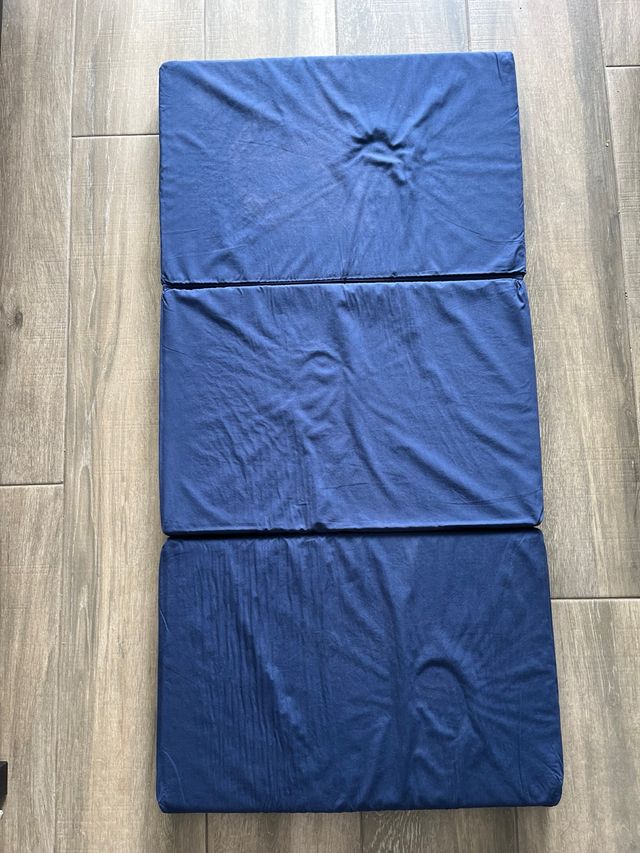 Colchón plegable para cuna de viaje. Fund desmontable color azul. Dimensiones totales 120x 60. 5 cm espesor. Plegado ocupa 60x40x15