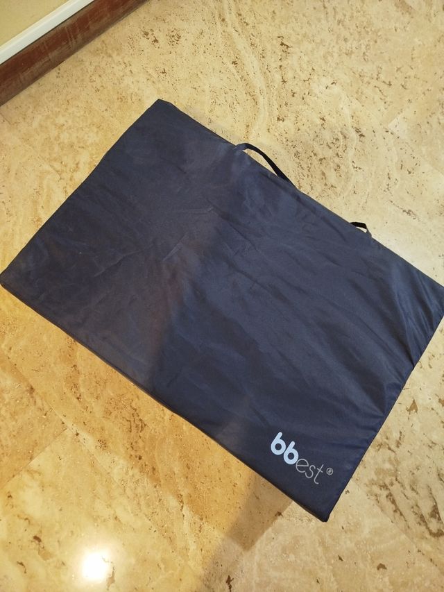 Colchón para cuna en muy buenas condiciones. Plegable. Forro impermeable. Color azul marino. Incluye funda. Marca bbbest. Medidas en la foto.