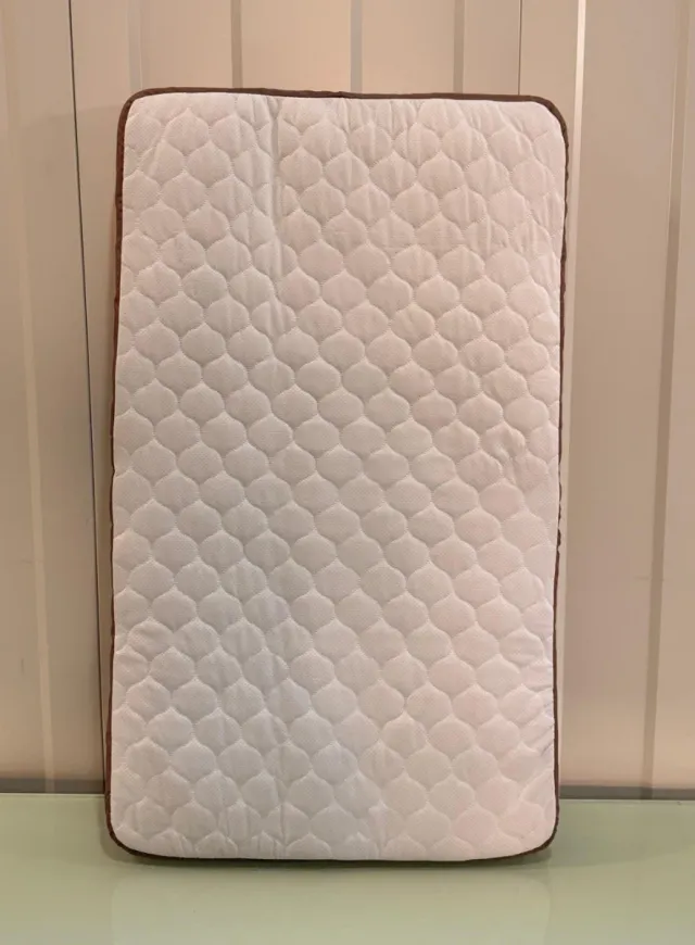 Colchón para cuna de viaje, diseñado para ser plegable y fácil de transportar. - Tejido blanco acolchado. - Ribete marrón en los bordes.