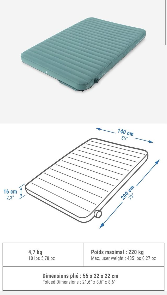 Detalles del productoColchón hinchable de camping para dos personas. Es resistente de 140 cm. Grueso y muy rapido de inflar y guardar.