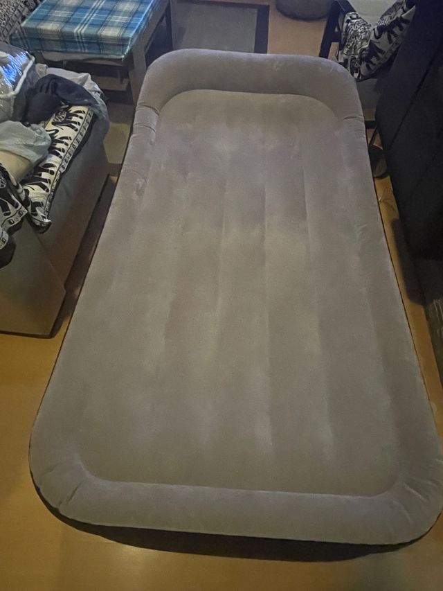 Detalles del productoColchón hinchable INTEX 99x191x 42 azul marino y superficie gris con textura suave y aterciopelada.