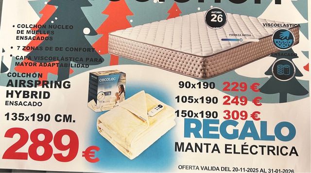 Colchón de muelle ensacado sin encapsular con visco de 26cm de altura, dureza media alta, muy cómodo con regalo de manta eléctrica 130x160 de Cecotec.