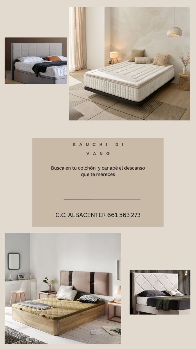 Detalles del productoBusca en tu colchón y canapé el descanso que te mereces. Gran variedad de colchones , muelles ensacados ,núcleo HR, visco. Composiciones de canapé y cabeceros, con las últimas novedades en decoración. Te ayudamos con tu presupuesto. Estamos en C.C. Albacenter 661 563 273.
