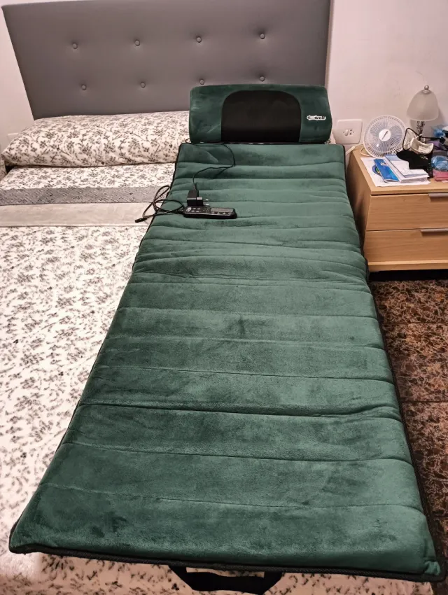Colchoneta de masaje en color verde oscuro, ideal para relajación. - Material suave al tacto. - Diseño acolchado con líneas horizontales. - Incluye almohadilla para la cabeza.