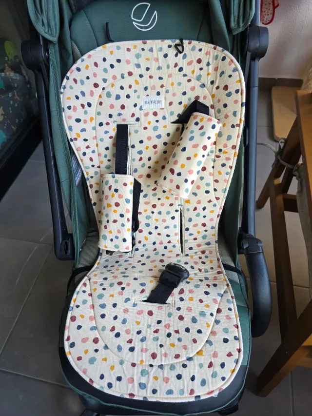 Detalles del productoColchoneta acolchada para silla de bebé con un divertido estampado de puntos multicolores sobre fondo beige. Añade comodidad y un toque de estilo.