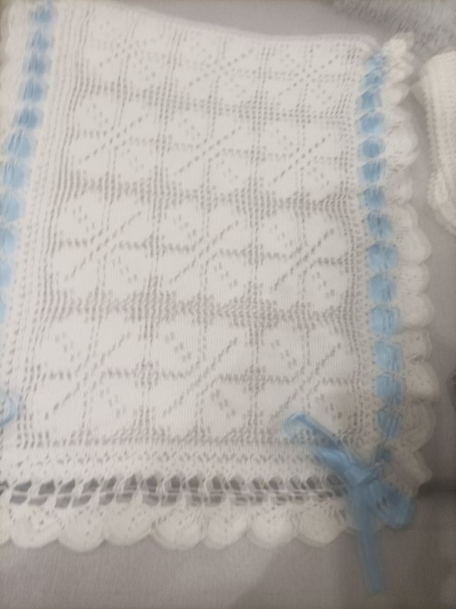 Detalles del productoPreciosa mantita de bebé hecha a mano con delicados detalles en crochet. Es ideal para usarla en el carrito o capazo.