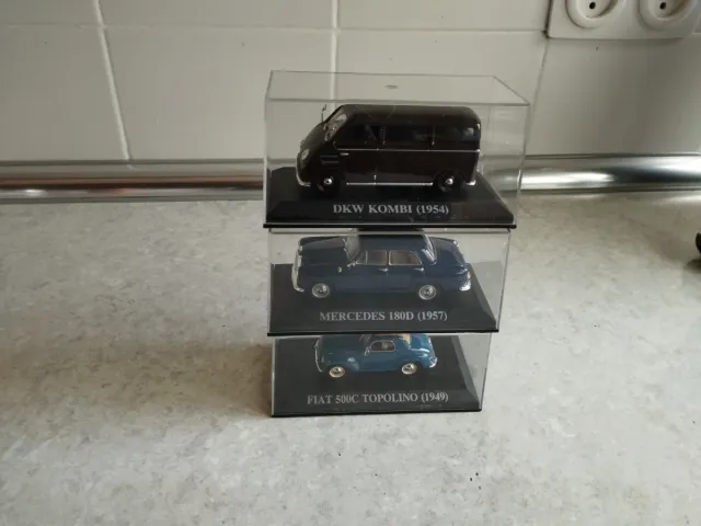 Conjunto de tres coches a escala de modelos clásicos. - DKW Kombi (1954) - Mercedes 180D (1957) - Fiat 500C Topolino (1949)