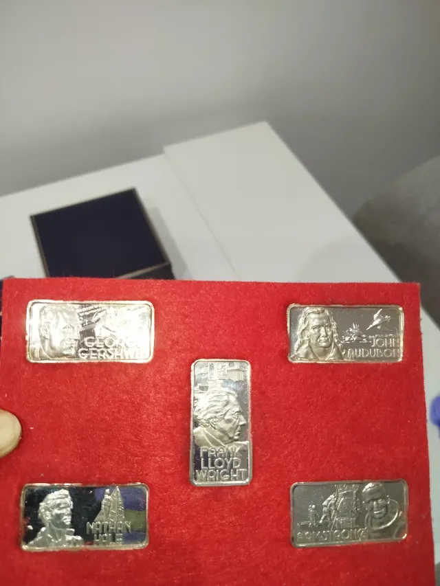 Detalles del productoColección de 5 onzas rectangulares de plata fina .999, The Hamilton Mint, con figuras históricas de Estados Unidos, busto y figuras singulares en el anverso y grabado escrito personalizado en el reverso con especificación de pureza y casa que acuña la pieza