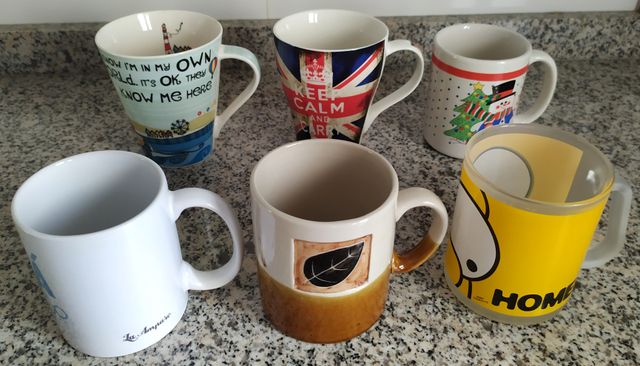 Bonita y alegre colección de seis tazas o jarras de desayuno variadas (mugs), de cerámica y vidrio con asas.