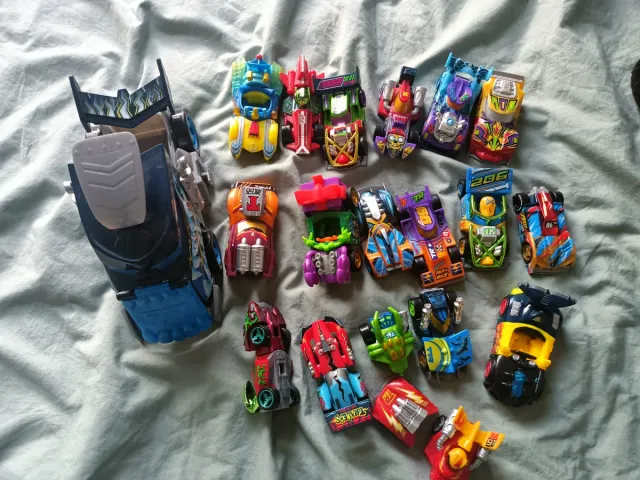 Detalles del productoLote de coches de juguete de la colección Tracers. Son vehículos de carreras con diseños llamativos y coloridos.