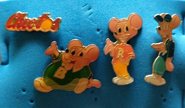 Detalles del productoLote de 4 pins de Cheetos de los años 90. Son pins esmaltados, con los personajes de las mascotas de Cheetos. Ideales para coleccionistas. - 1 pin con el logo de Cheetos. - 3 pins con los personajes BOLITAS, RICITOS Y TORCIDITOS