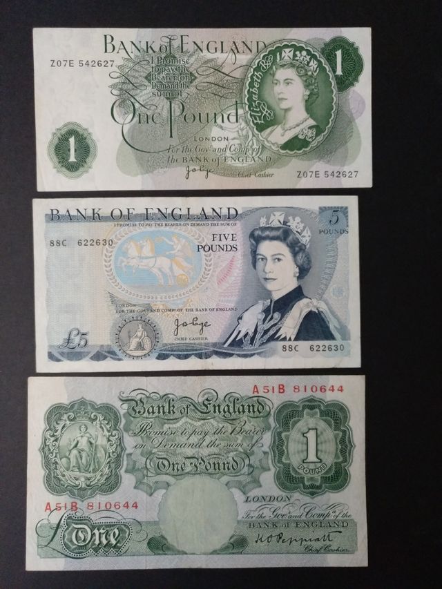 Detalles del productoTres billetes antiguos de colección del Banco de Inglaterra. Son dos billetes de una libra y un billete de cinco libras. Los billetes muestran un estado de conservación muy bueno.