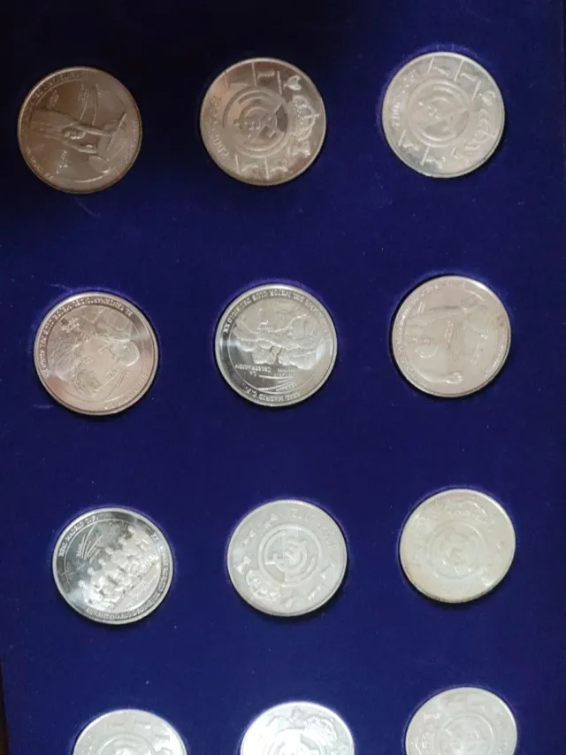 Conjunto de monedas de plata con diversos diseños. - Monedas conmemorativas. - Diseños detallados. - Material: Plata.