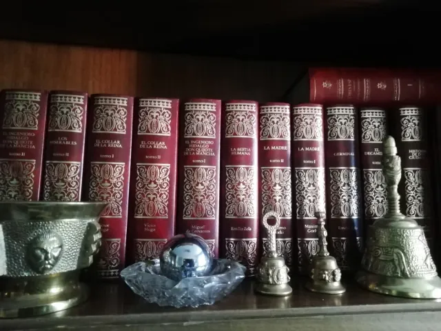 Conjunto de libros antiguos con tapas duras y detalles dorados.