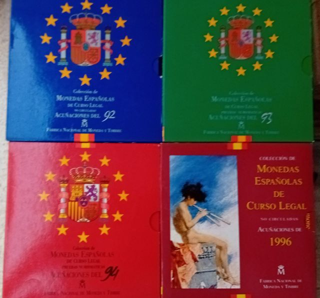 Detalles del productoSe venden cuatro estuches de monedas españolas de curso legal no circulantes, acuñaciones de los años 1992, 1993, 1994 y 1996. Fabrica Nacional de Moneda y Timbre. - Estuches NUEVO REY JUAN CARLOS I