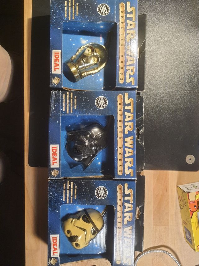 Detalles del productoColección compuesta por 3 ratones serie PS2 de Star Wars, con C3PO, Darth Vader y Stormtrooper. Cada ratón serie PS2 está para estrenar. Cajas en estado correcto, la que peor está es la de Darth Vadrt (ver la 3a foto). Sin testear para no estropear cajas. Perfectos para coleccionistas o ordenadores retro windows 95 y 98, ms dos