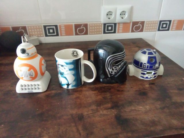 Colección de artículos de Star Wars. - Figura BB-8. - Taza con diseño de Stormtrooper. - Figura Kylo Ren. - Figura R2-D2.