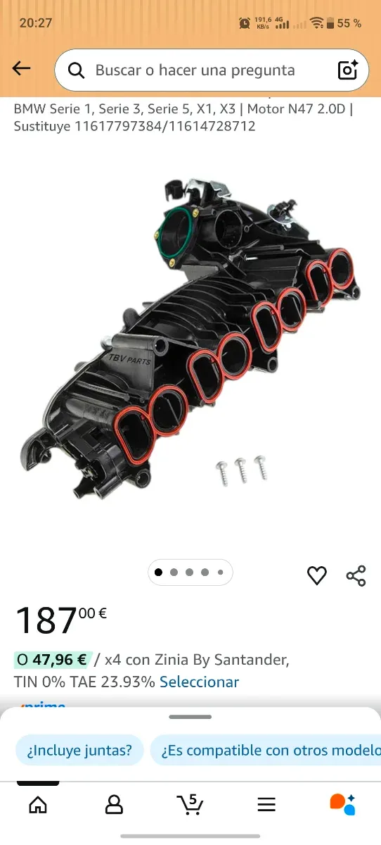 Colector de admisión para BMW Serie 1, 3, 5, X1, X3 con motor N47 2.0D. - Sustituye referencias 11617797384/11614728712. - Incluye tornillos.