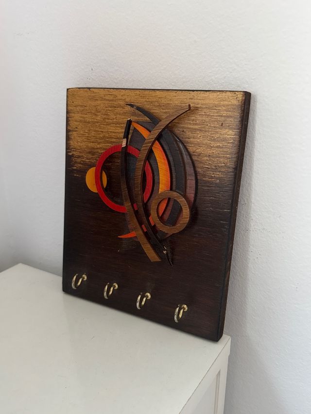 Detalles del productoEste colgador de llaves de madera es una pieza decorativa y funcional para tu hogar. Su diseño abstracto añade un toque artístico a la entrada.