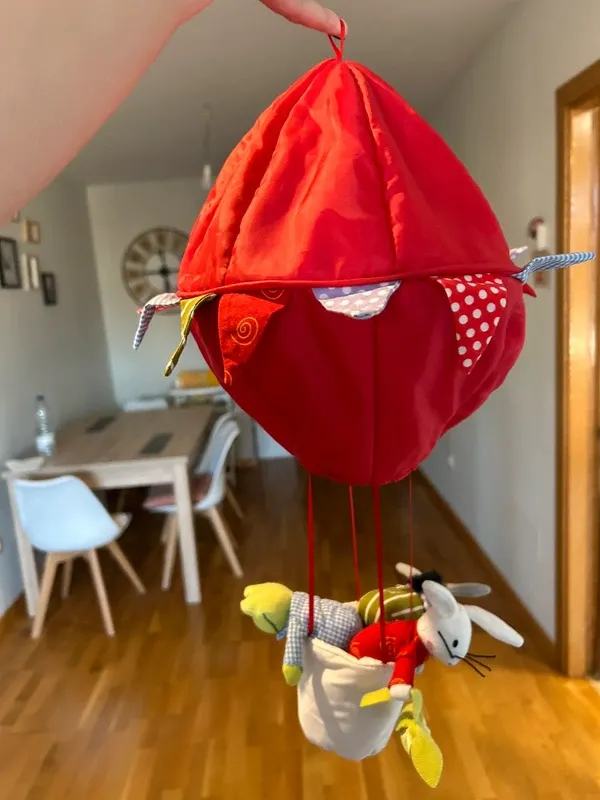 Mobile colorato a forma di mongolfiera, ideale per decorare la culla o la cameretta. - Mongolfiera rossa in tessuto. - Cestino con peluche. - Decorazioni colorate.