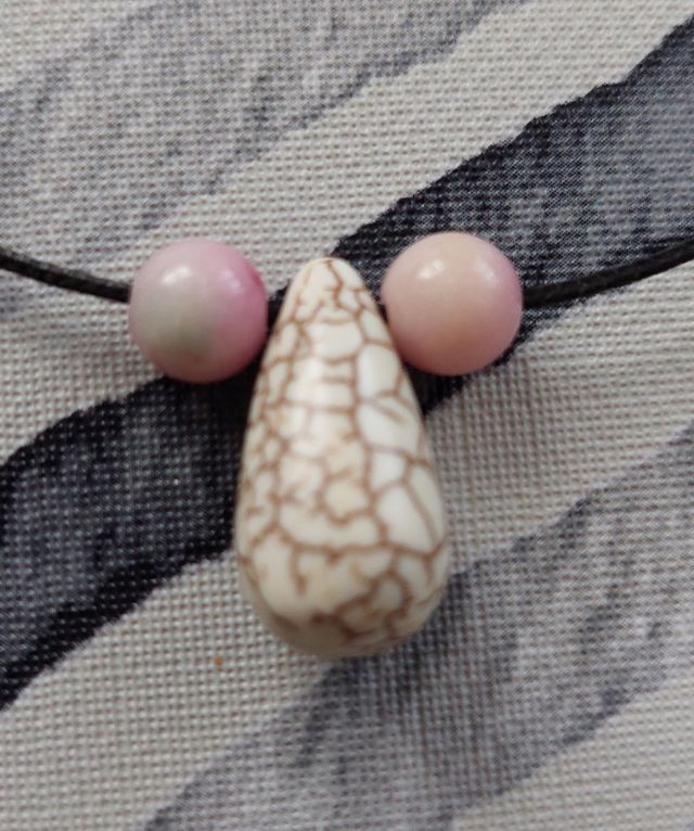 Colgante de abalorios de resina, con cuerda imitación cuero. Tiene 2 nudos corredizos para poner a la altura que desees, puedes llevarlo como gargantilla o como colgante.